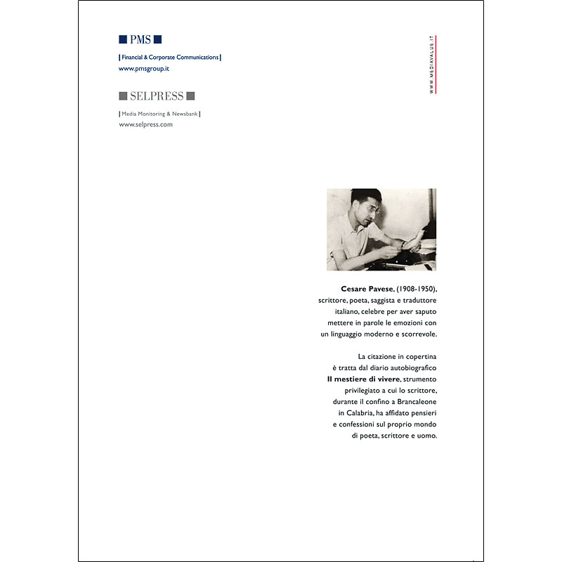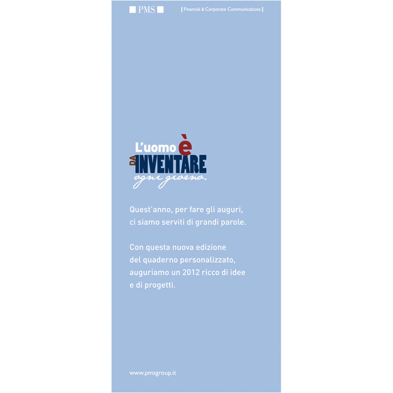 Concept, progettazione grafica, copywriting, impaginazione e stampa dei materiali per il gadget natalizio rivolto ai giornalisti e clienti della società: quaderni tematici d’ispirazione letteraria, personalizzati in copertina e alle pagine interne con logo aziendale e nome e cognome del destinatario, segnalibro allegato e busta coordinata per la spedizione.
