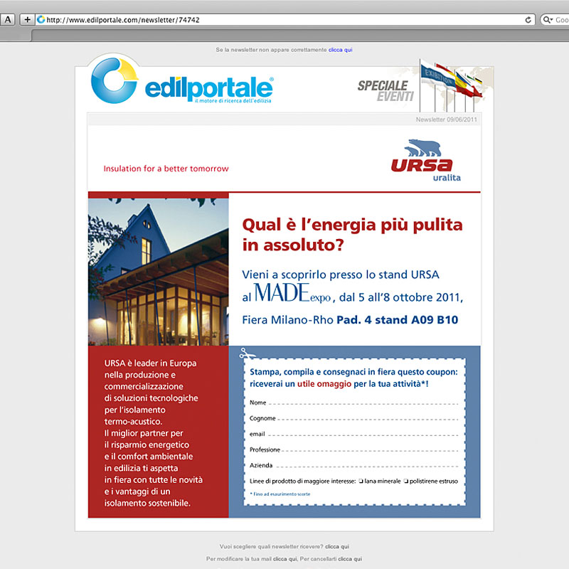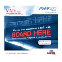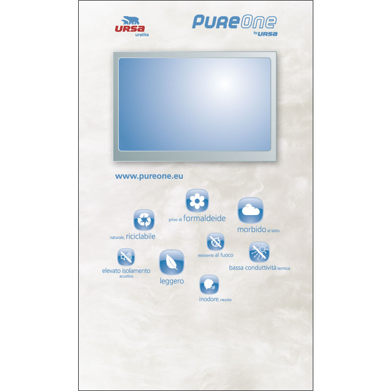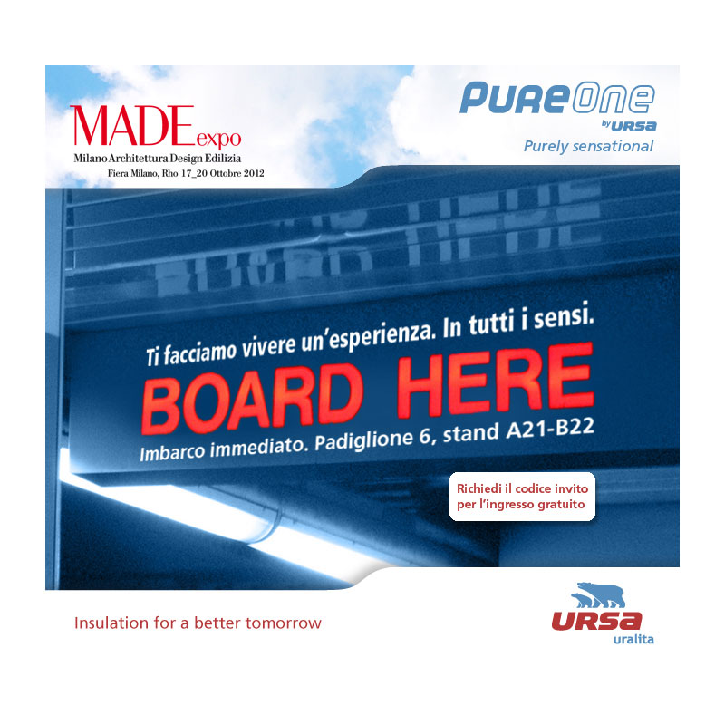 Progettazione creativa dello stand al MADE EXPO per il lancio del prodotto PureOne sul mercato italiano. Personalizzazione grafica del gadget per i visitatori: un magnete con QR code che rimanda al sito del prodotto. Impaginazione e versione digitale del mini-catalogo sulle caratteristiche della nuova lana minerale, top di gamma tra gli isolanti Ursa.